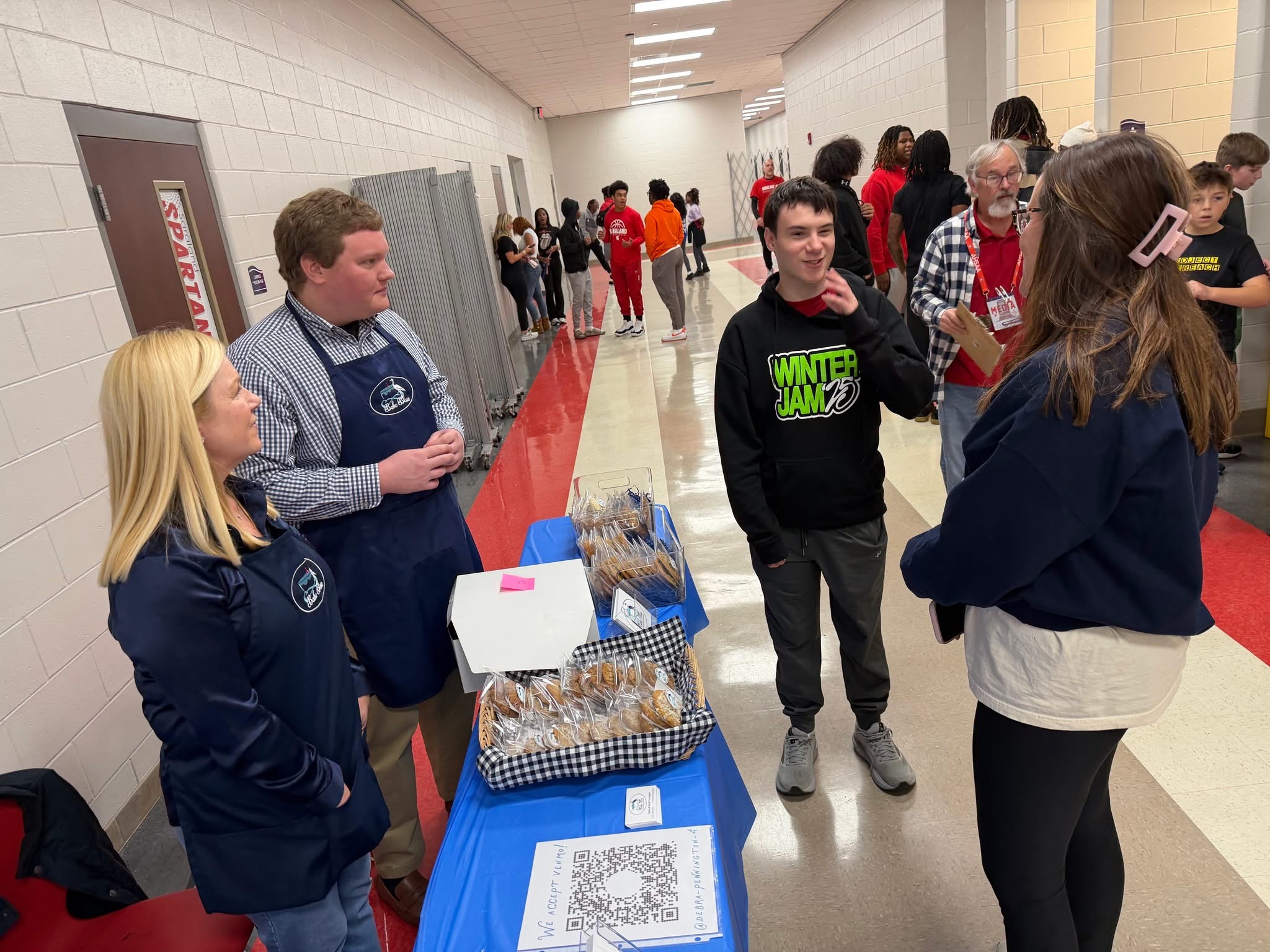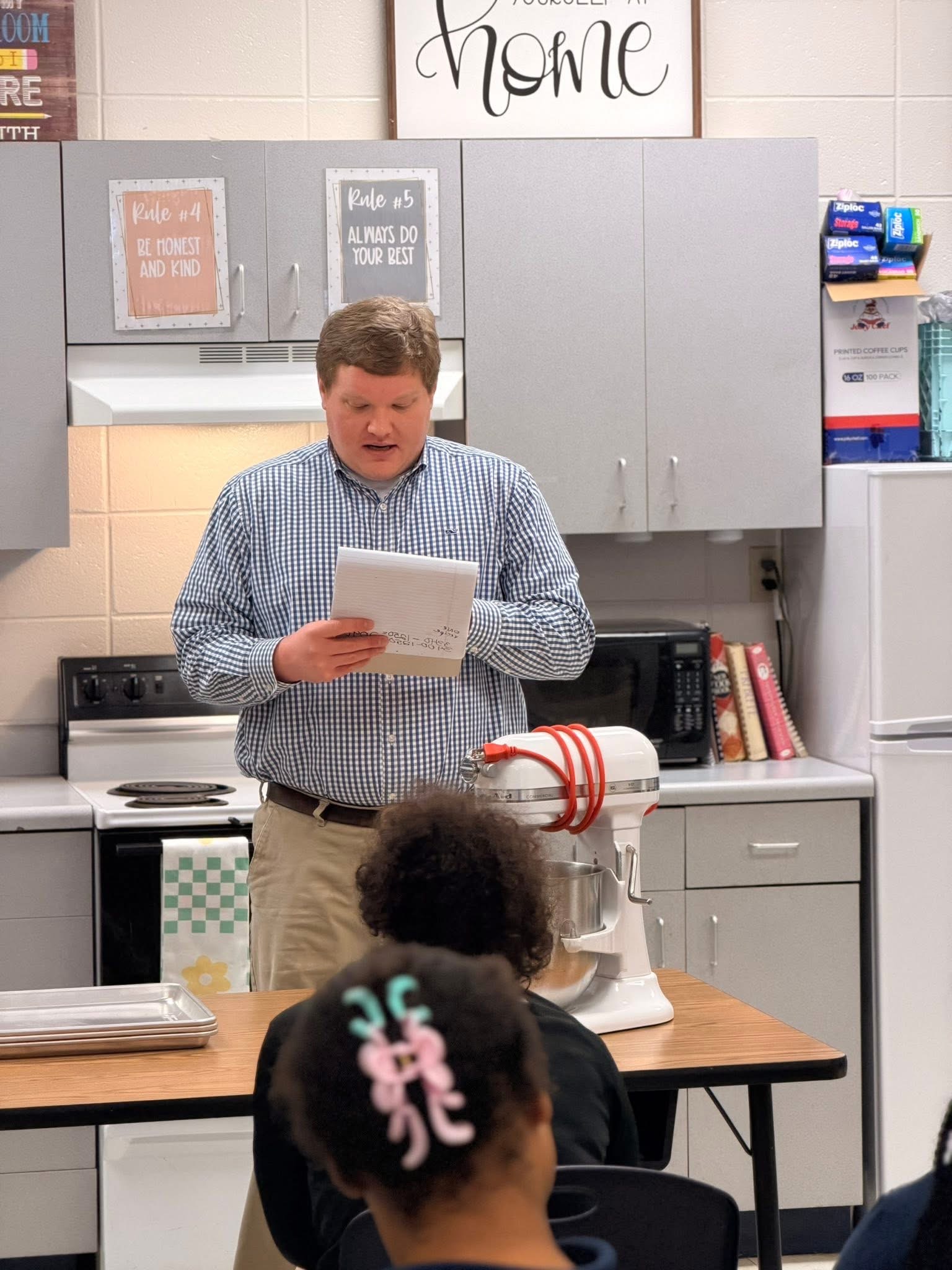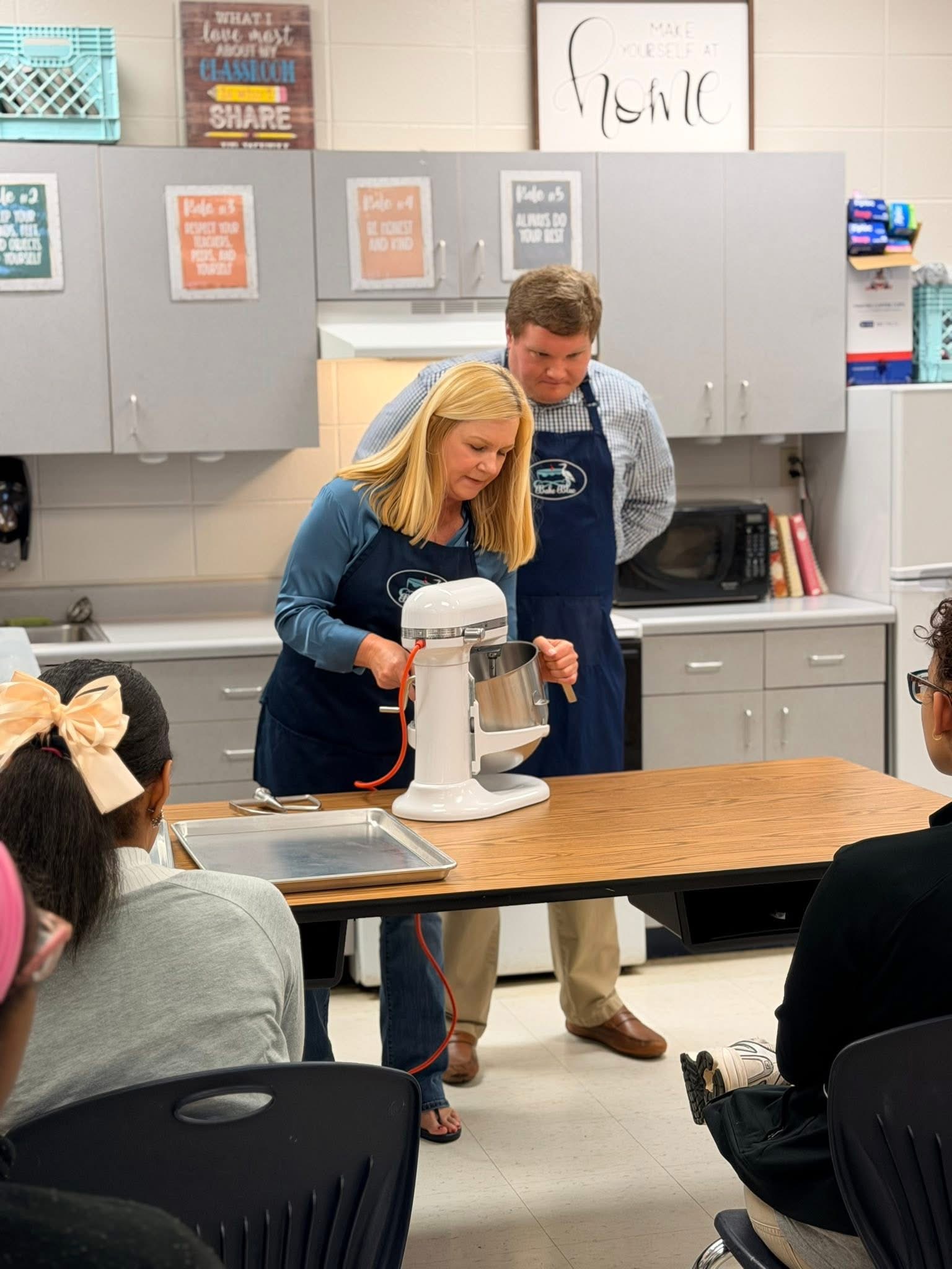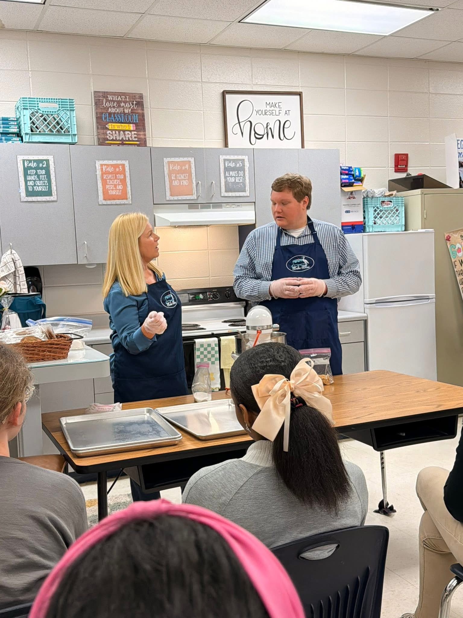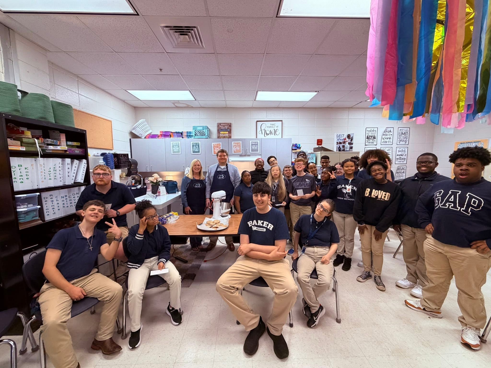 Bake Blue speaking and cooking for the Project Outreach at Baker High School
